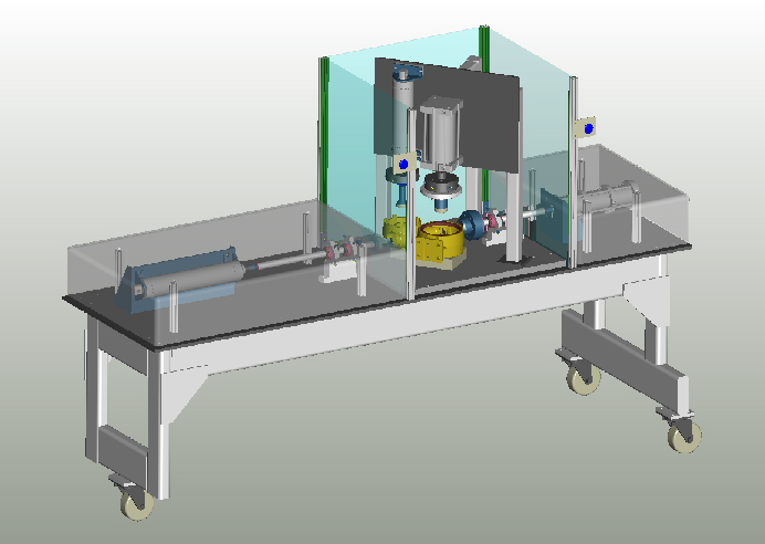The operator's function is to manually install the bearings, seal, plug, and cast housing into their respective positions. The machine is capable of pressing in 3 bearings and 1 seal into their respective seats with .050" misalignment on machined bores in both horizontal and vertical planes. It also inserted and dimpled a steel plug into the same cast aluminum gear case housing. The machine operated at a 8 second cycle rate. All axes are pneumatically driven .