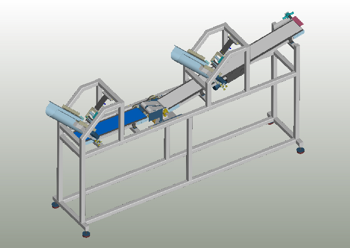 This prototype machine was designed for proof of concept in an automated sandwich making line. The task was to detect defective bread slices, reject them, and replace them with acceptable bread slices downstream at a rate of 1 slice per second. It was also required to feed the acceptable slices in synchrony with the automated line of the main system.This prototype machine introduces the bread by the feed mechanism at the machine's far left end rejects it before the feed replacement station. Not shown are the vision system and product collection systems for the acceptable and rejected slices. All three conveyors are driven by the exit conveyor.